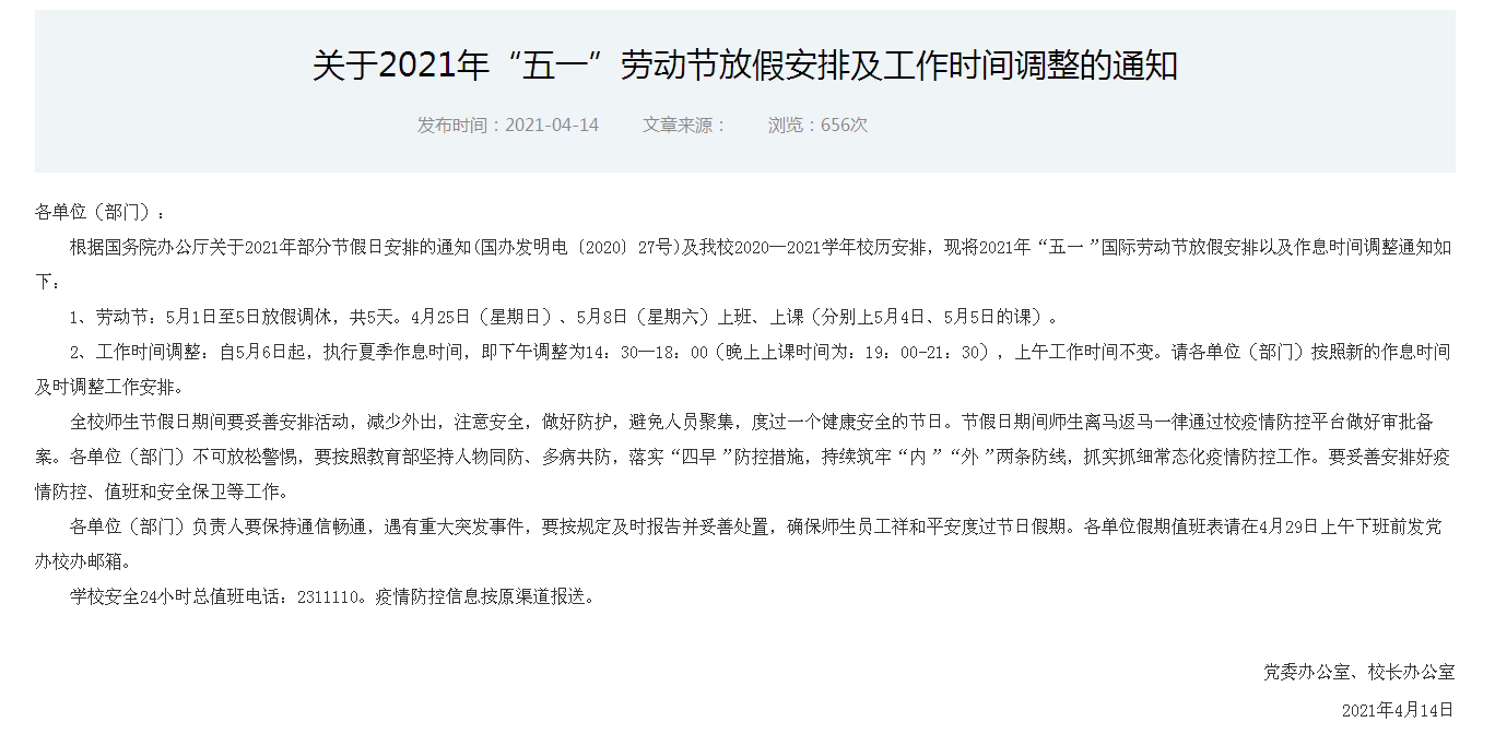 关于2021年“五一”劳动节放假安排及工作时间调整的通知