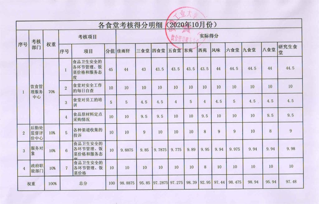 各食堂考核得分明细(2020年10月份)