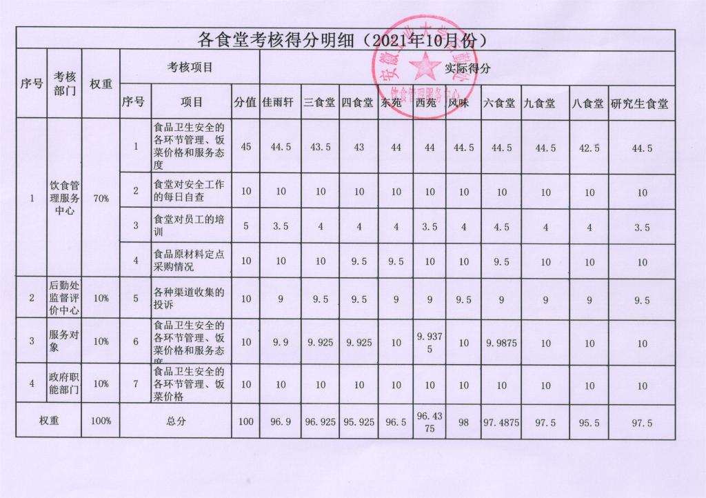 各食堂考核得分明细(2021年10月份)