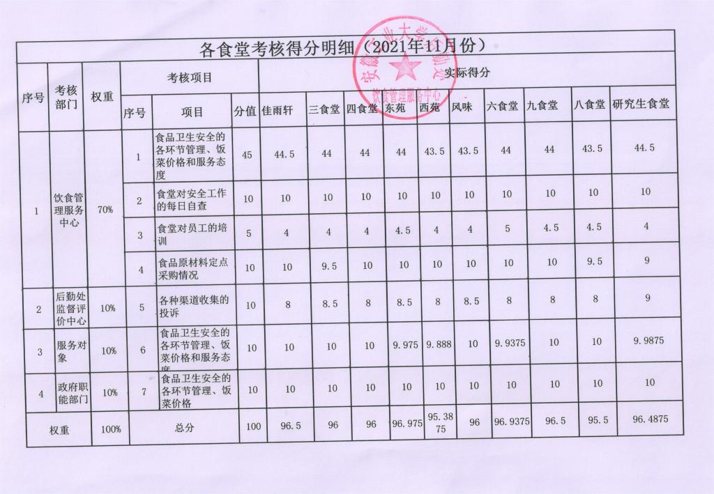 各食堂考核得分明细(2021年11月份)