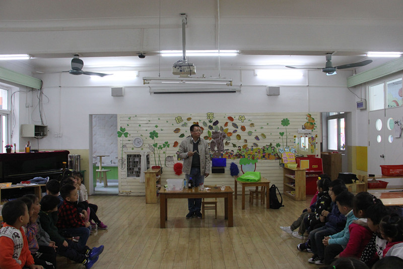 11月15日下午,大一班岳亦洋爸爸——安工大化工学院岳彩波教授,带着瓶瓶罐罐和各种实验器材走进班级,给小朋友做了两种液体混合沉淀、试管粉末变色和火山喷发三个科学小实验。