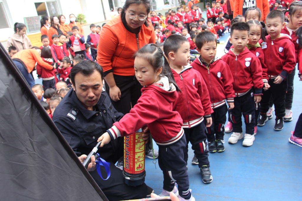 上午十时整,伴随着紧急的警报声响起,各班教师带领幼儿拿起湿毛巾,捂住口鼻,弯腰小步快走,按照消防预案的疏散线路,迅速、有序地撤离到安全区域。随后,幼儿园组织孩子们进行了消防安全知识宣传教育,校安全保卫部(处)工作人员给孩子们介绍并演示了电子灭火器,并请小、中、大班的部分幼儿参与体验了灭火自救的方法。