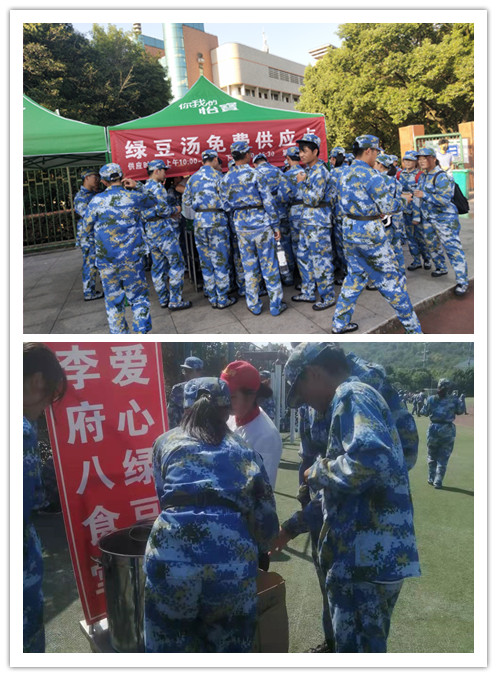 学生食堂主动在新生军训场边设立绿豆汤、矿泉水免费供应点,拉上了“免费绿豆汤供应点”的横幅,将准备好绿豆汤免费供师生饮用,让师生在休息间隙喝上喝豆汤清热解毒、止渴消暑。