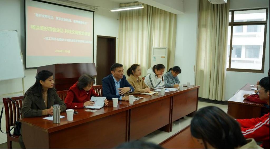 11月4日上午,后勤处学生公寓管理服务中心相关人员走进管工学院,与学院团学干部一起,交流研讨育人工作。