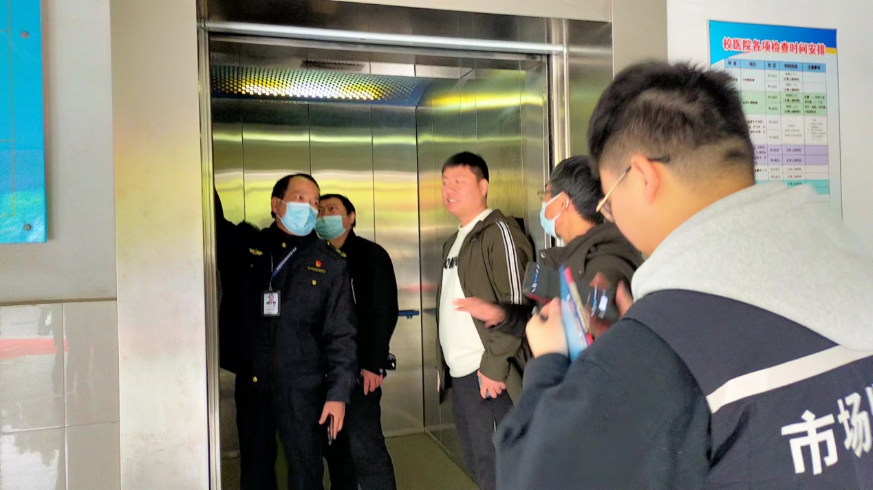 检查组首先对学校秀山校区33台电梯台账进行随机查阅,重点检查了电梯《特种设备使用登记表》、《产品合格证》、近期电梯检验合格证、电梯维保合同、电梯维保记录和安全管理员证书等。实地查看了校医院医用电梯、第一教学楼客梯和第九食堂货梯,查看电梯运行是否平稳,轿厢内是否张贴电梯应急救援电话、电梯安全乘坐须知、电梯检验合格标志,现场对电梯报警装置、对讲通话装置进行检验。