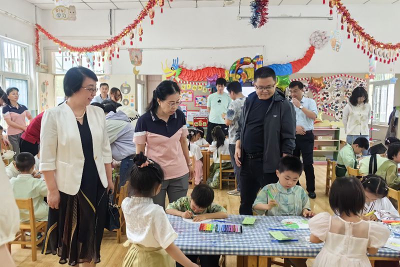 顾明言一行查看了幼儿园的园区环境和硬件设施,详细了解教育教学组织、师资队伍建设、保育安防工作等情况,询问目前存在的困难和问题。顾明言一行走进各个教室、活动室,与孩子们亲切互动交流,祝愿小朋友们节日快乐、健康成长。