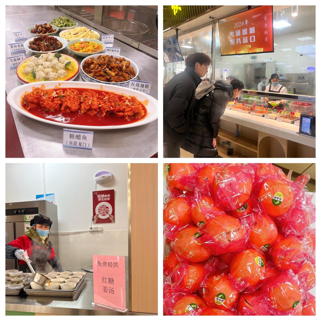 为做好此次活动,中心精心谋划,提前筹备,印制考研专属就餐券,提前发放给我校3700余名考研学生,在食堂特别设立考研暖心服务窗口,制作宣传展板,营造活动氛围,制定考研特色菜谱,有“金榜题名”酱焖猪蹄、“红红火火”辣子鸡丁、“鹏程万里”红烧翅根、“鱼跃龙门”糖醋鱼,搭配“圆圆满满”雪花圆子、“节节高升”清炒笋丝、“一举夺魁”素炒秋葵、“事事如意”西红柿炒蛋,以及象征“心想事‘橙’”的水果橙子和温暖人心的免费红糖姜汤,充分表达了后勤“饮食人”对每位考生的美好祝愿和深切关怀。活动当天,中心监管人员认真履职尽责,深入各食堂检查食品安全工作和活动准备情况,重点检查采购验收、加工制作、烧熟煮透、饭菜保温、食品留样及环境卫生等关键环节,确保每位考生都能吃到安全、美味的饭菜。