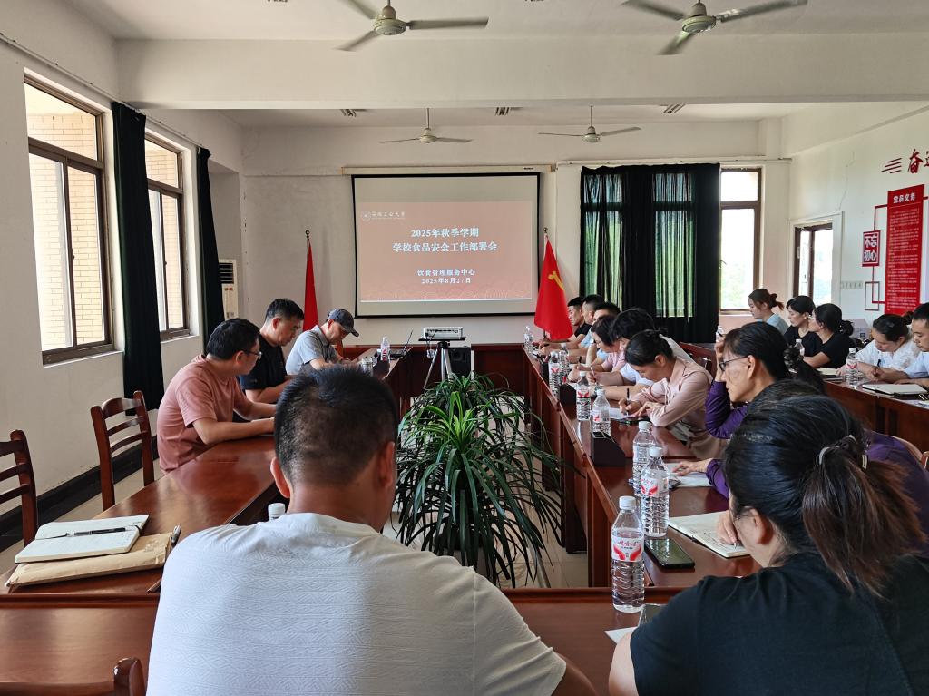 为确保2025年秋季学期开学及新生报到期间餐饮保障工作平稳有序推进,筑牢食品安全防线,全面提升师生餐饮服务品质,8月27日下午,后勤处召开2025年秋季学期学校食品安全工作部署会,后勤处领导、饮食中心食品监管人员、社会餐饮企业食品安全总监、食品安全员参加了会议,会议由饮食管理服务中心负责人主持。