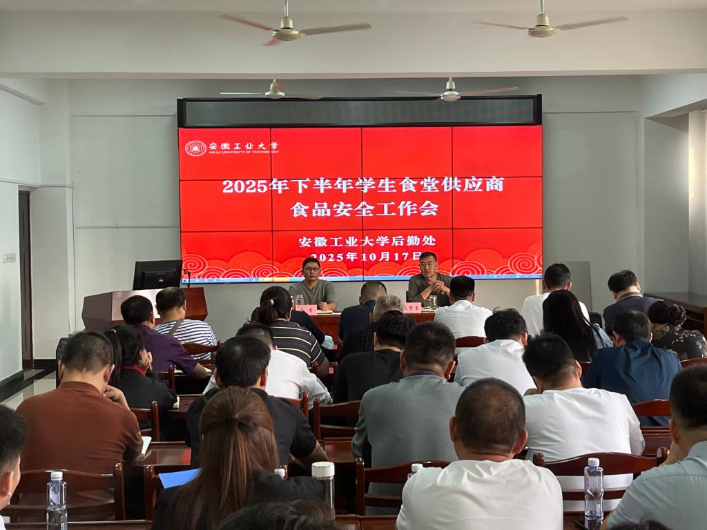 为全面筑牢校园食品安全防线,压紧压实食堂经营企业与原材料供应商的责任,10月17日下午,后勤处组织召开2025年下半年学生食堂原材料供应商食品安全会议。后勤处领导、饮食管理服务中心负责人及监管人员、原材料供应商代表、食堂食品安全总监约40人参加了此次会议。会议由饮食管理服务中心负责人包军主持。