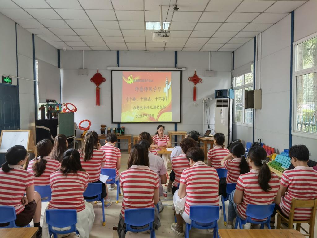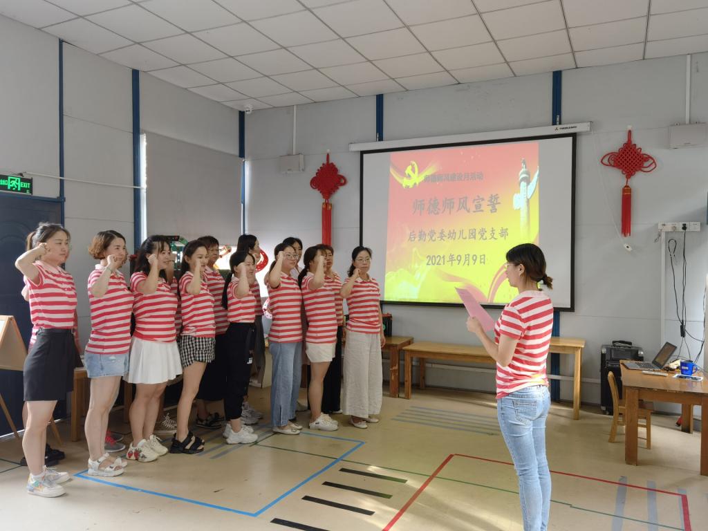 会上,园长宫玲玲就马鞍山市教育局关于开展2021年中小学幼儿园“师德师风建设月”活动进行了动员部署,并带领教职工学习《师德师风之“十要、十不准、十禁止”》。之后在支部书记戴明珠的带领下,教职工重温了教师誓言。