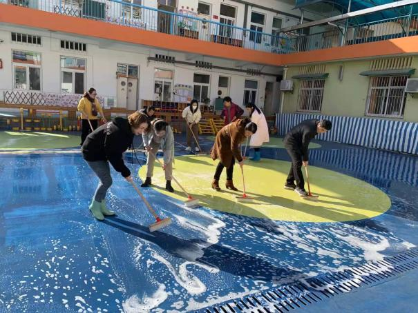 为了使工作更加细致有序地进行,党员同志分成三组,对园内的多处死角展开清扫。一组同志拿起水龙头、拖把清洗幼儿园硅PU地坪操场、篮球场。大家不怕脏、不怕累、撸起袖子加油干,黯淡失色的操场变得干干净净,焕然一新。另一组党员同志来到幼儿园厨房周围,有人拿着扫帚,仔细认真地清除每一片落叶,有人蹲下来,用手直接将沉积很久的淤泥一把一把地装进垃圾袋中,保障厨房重地的冬季安全。第三组党员同志在确保安全的情况下,手扶栏杆,清扫幼儿园二楼防护雨棚上的落叶和灰尘。