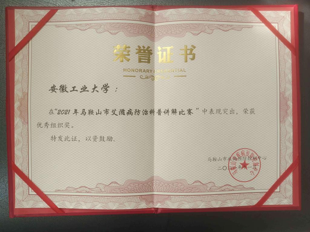 同时校医院组织部分学生参加2021年马鞍山市艾滋病防治科普讲解比赛,获得了“优秀组织奖”,两名学生作品分别获得三等奖、优秀组织奖,并获得“马鞍山市艾滋病防治宣传志愿者”称号。