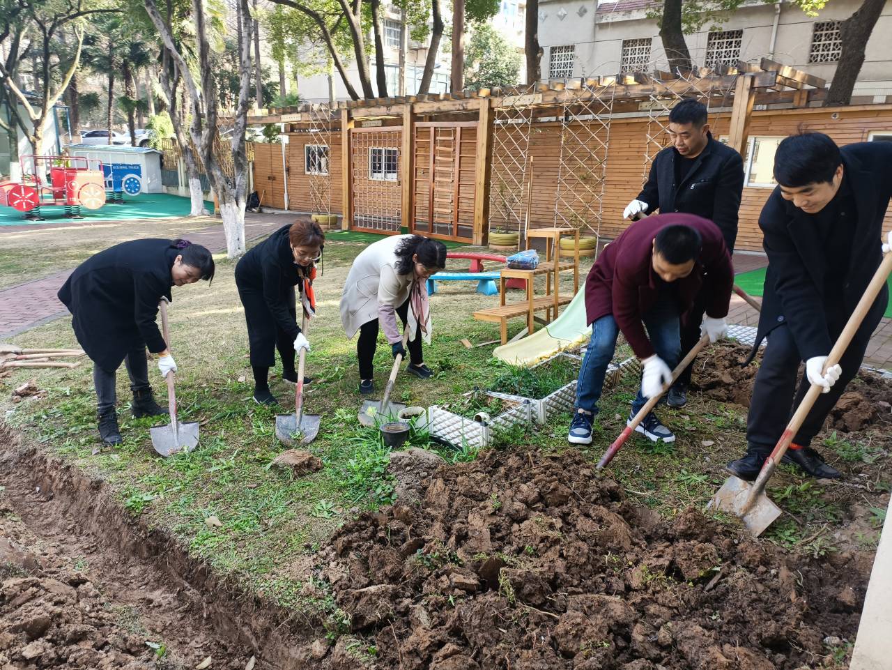 活动前,幼儿园党支部书记、大班年级组长与校园中心的同志们共同绘画、设计“绿色迷宫”图纸。活动现场,大家热情高涨、干劲十足,分工明确,对植树的区域进行刨坑、除草、松土,为大班幼儿亲子植树活动做好前期准备。